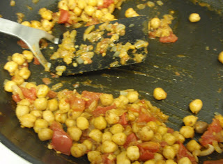 My husband and I have recently taken up bridge. We're aware that it's a nerdy, old-timey pursuit, yet we really like it...maybe exactly because it is so dusty and grandma-esque. On Friday night we had our bridge buddies over, and since I had an extremely ripe tomato, cilantro and garbanzo beans I thought I'd make a hummus-like dip version of the Indian dish Chana Masala to nibble on between tricks.