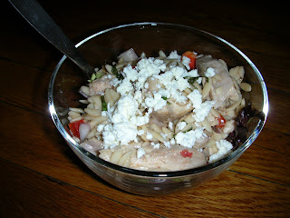 Like a winter stew, this dish from June's Cooking Light is served all in one "pot" and has everything you need in a meal: protein, carbs, starch, veggies. Plus, it's a cool and tasty dish for summer, with a very light dressing. I happened to have frise and skinless chicken thighs, so I substituted those for the arugula and chicken breasts. I had an especially tasty sheeps milk feta which I used instead of goats cheese. If you're like me and would rather spend time than money, buy your veggies whole and put your knife skills to work and quickly grill your whole chicken breasts.