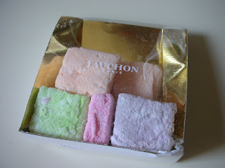 Inspired in part by Dorie Greenspan's adoration of it, I dragged my husband to legendary Parisian fancy food store, Fauchon, last Saturday. They have two separate stores along the Place de la Madeleine in the 8th Arrondisement; one with ready to eat foods and a cafe and the other filled with packaged foods to take home. Decorated in pink, black and lucite, the former storefront is a foodie jewel box filled with oh so precious treats -both sweet and savory. A group of tourists was jamming the macaron and bread stations while the jars of ready-to-eat foie gras went largely unnoticed. Well, they did look slimy and icky all jarred up like that. Since our bellies were already full from some croissant or other, we moved across the block to buy some things to enjoy back in NYC. Equally pink, but not quite as precious, the latter store had open stock shelves and lots of employees walking about to help. We were thrilled to encounter a woman with excellent english near the condiment and spice area. My husband adores mustard almost as much as I love mayo and I was determined to buy a couple of special mustards for him...it was his birthday, after all. After determining our type of palate (spicey=yummy), our helpful associate recommended a slew of varieties: champagne, truffle, horseradish, and piment d'espelette. The last incorporates a basque pepper that is so revered, it inspires week-long festivals as the peppers dry. Wanting the frenchiest mustard, we settled on small jars of the champagne and espelette -stay tuned for tasting review.