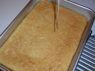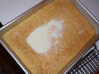 Whisk together the evaporated milk, sweetened condensed milk and the half-and-half in a 1-quart measuring cup. Once combined, pour the glaze over the cake. Refrigerate the cake overnight.
