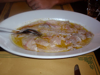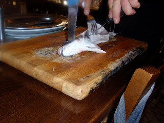 Quite a presentation. The whole process took ten minutes and was admirably professional with lots of care and little waste. The proud proprietor even brought us Prosecco as an accompaniment "because it's the best with this." The essence of Venetian cuisine: seafood: simple and fresh. Delicious and memorable!!